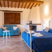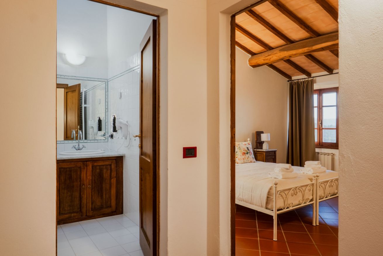 Suite with 2 bedrooms in the farmhouse “Pastore" at Il Borgo, with large living room equipped with comfortable sofas and TV. The sleeping area includes two double bedrooms (including one with two separable beds) and two private bathrooms. Air Condition. Rooftop terrace (on first floor) or patio (on ground floor), with stunning views and outdoor furniture. Access to the pool included.
