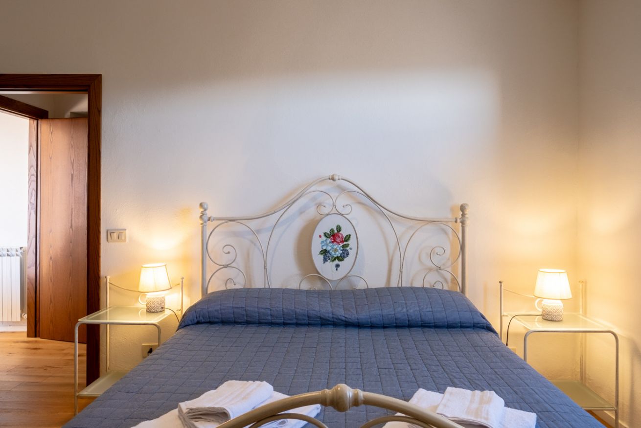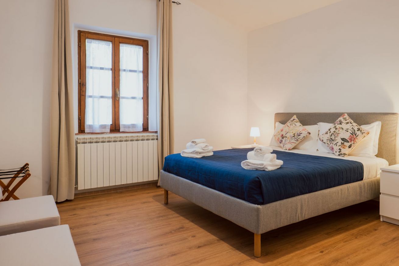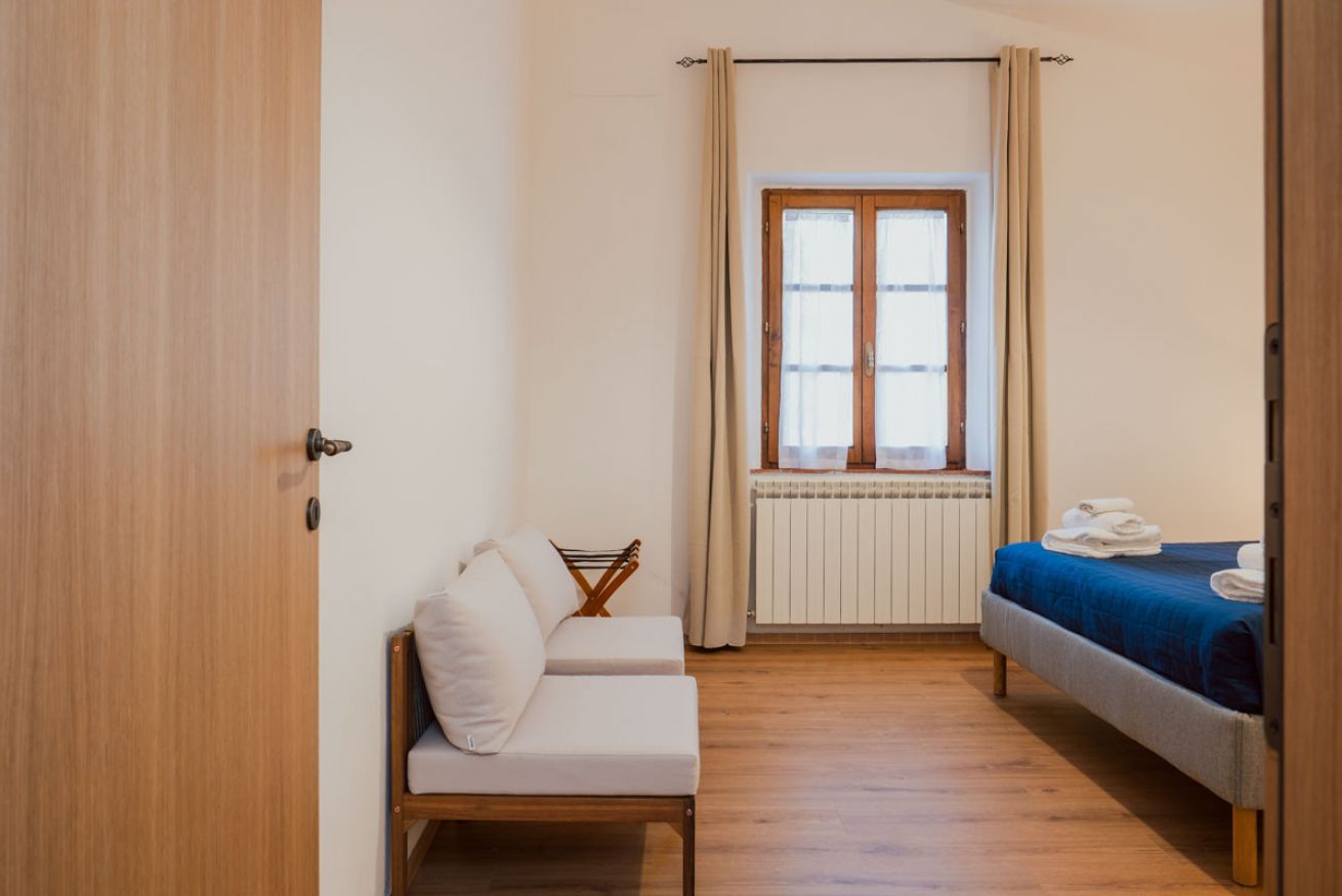 Accommodation with two cosy and functional double rooms, with living room equipped with TV, sofas and decorative fireplace. There is a double bedroom and a second bedroom, which can be configured with two single beds or a double bed. The rooms have a bathroom with shower. Includes access to the swimming pool with panoramic views of the hills. Located in the main farmhouse ‘Fattoria’ at Il Borgo.