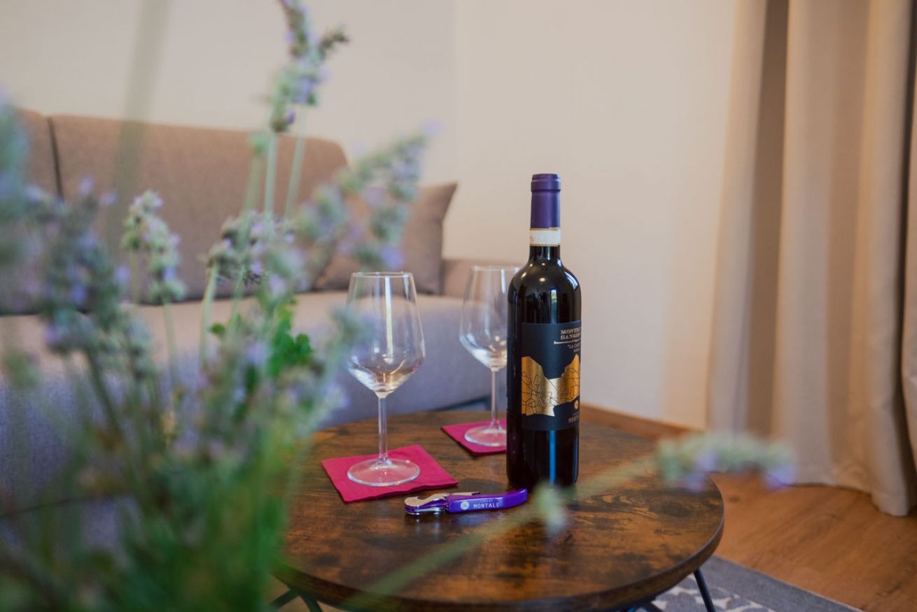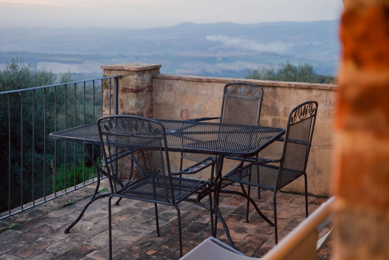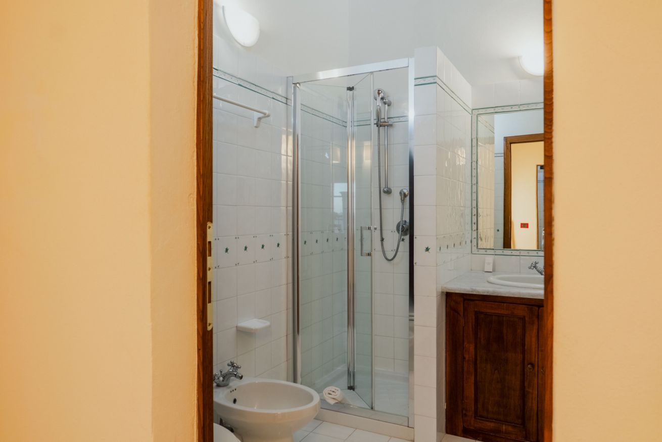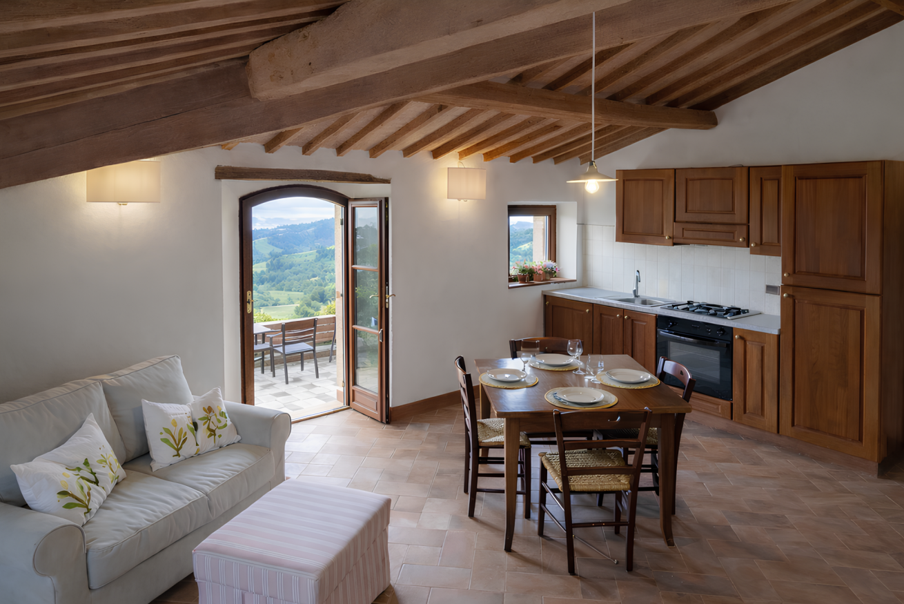 Accommodation with two cosy and functional double rooms, with living room equipped with TV, sofas and decorative fireplace. There is a double bedroom and a second bedroom, which can be configured with two single beds or a double bed. The rooms have a bathroom with shower. Includes access to the swimming pool with panoramic views of the hills. Located in the main farmhouse ‘Fattoria’ at Il Borgo.