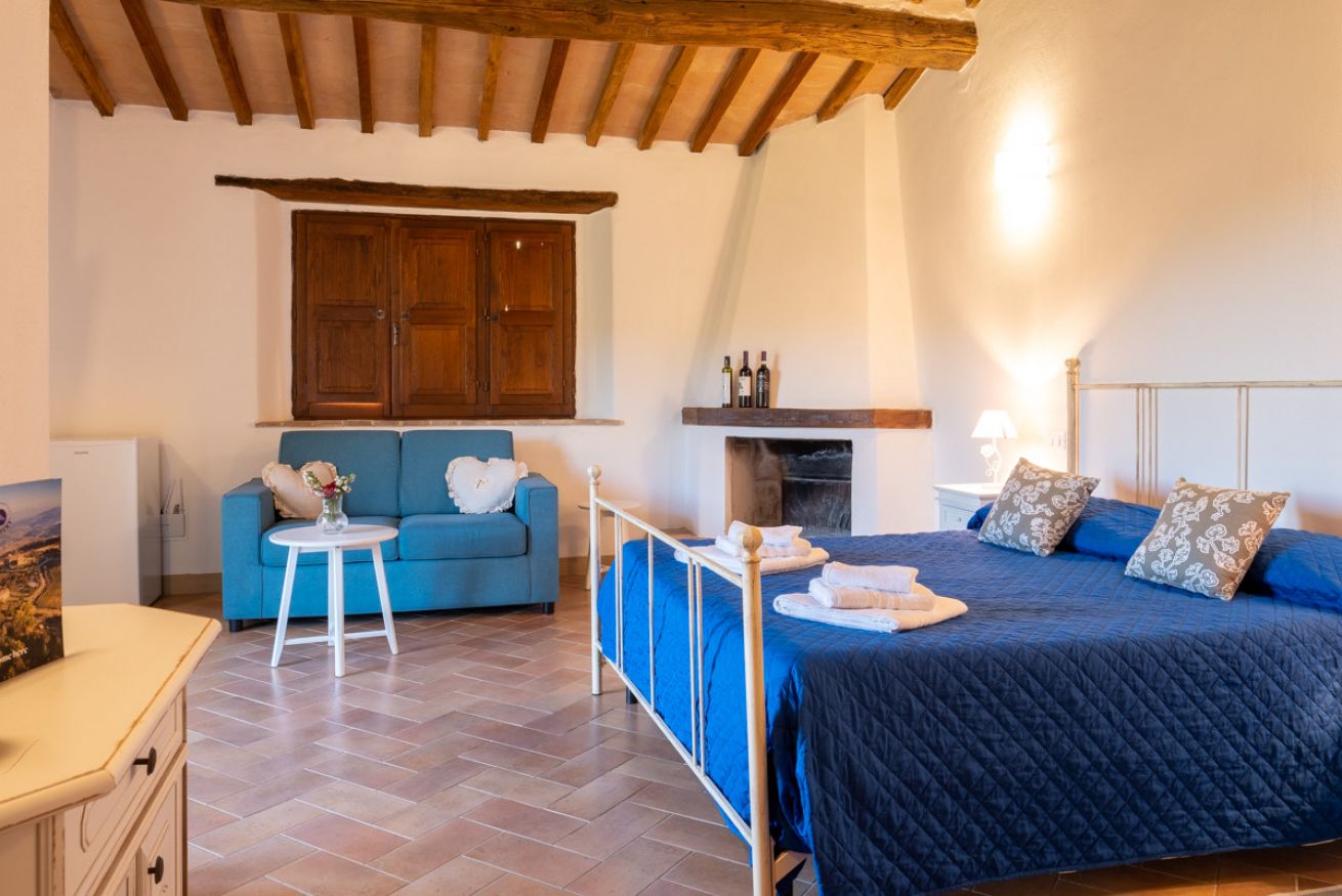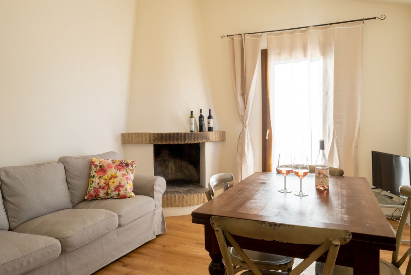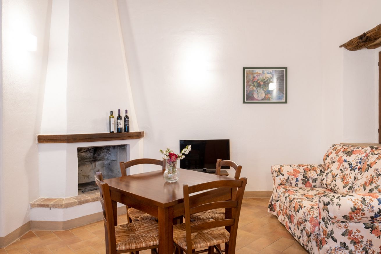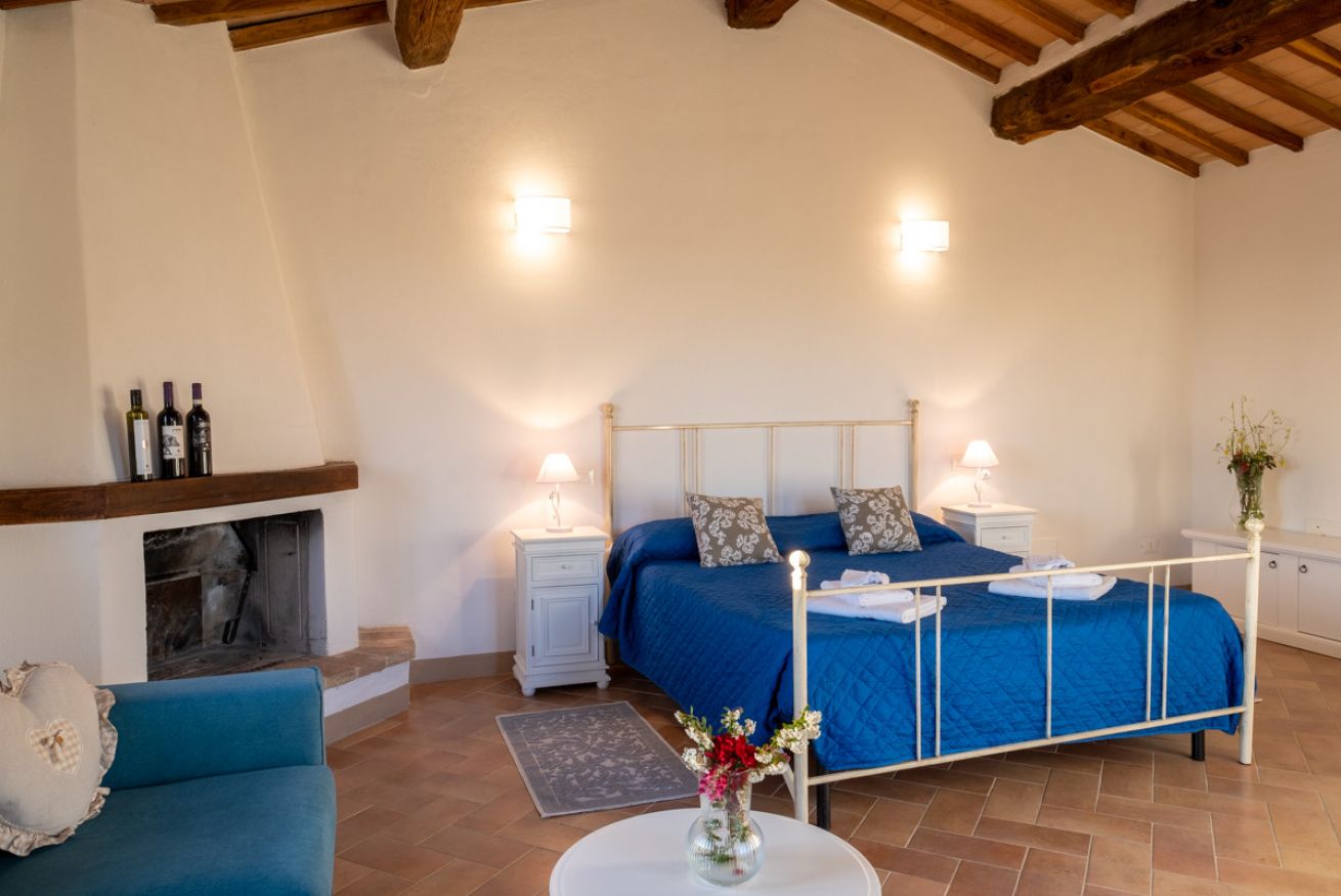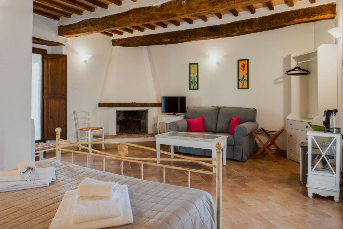 Elegant suite located on the 1st floor of the main farmhouse at Il Borgo, with living room, TV and sofa, fireplace. It has a double bedroom with private bathroom (ensuite) and optional double sofa bed in the living area. Air conditioning included. Access to the swimming pool.