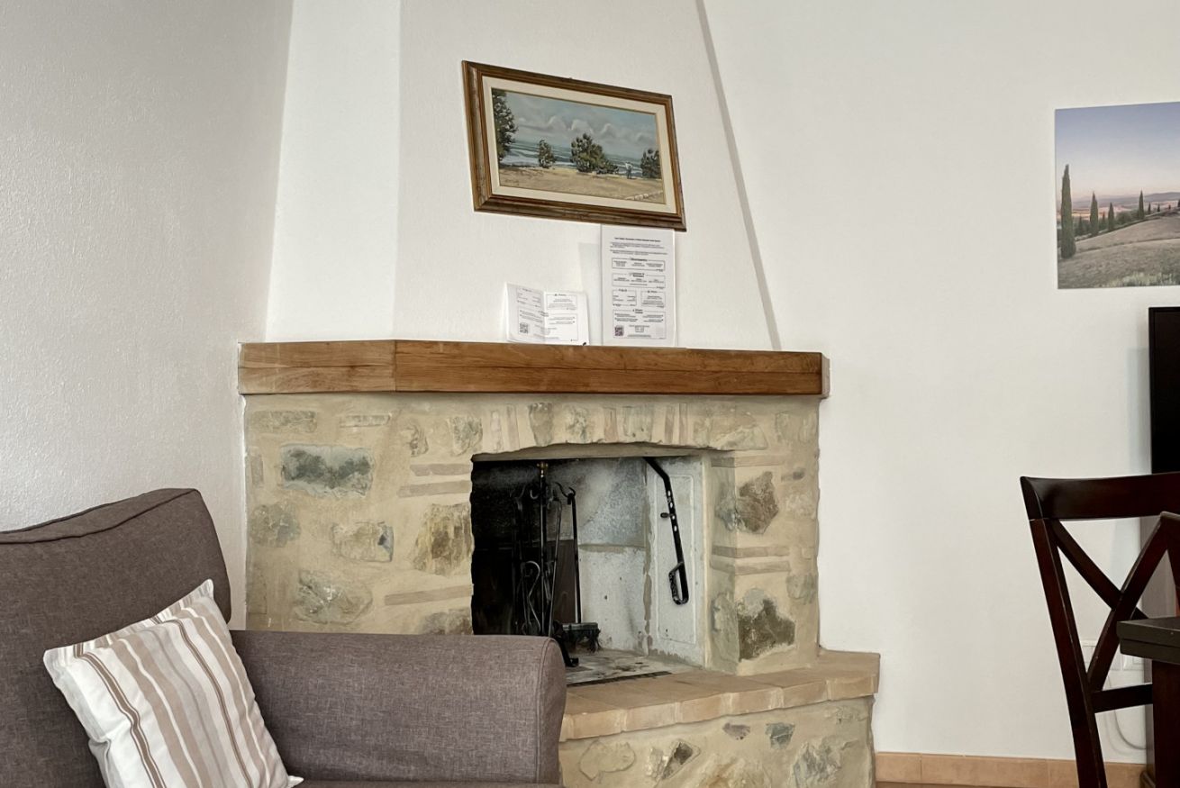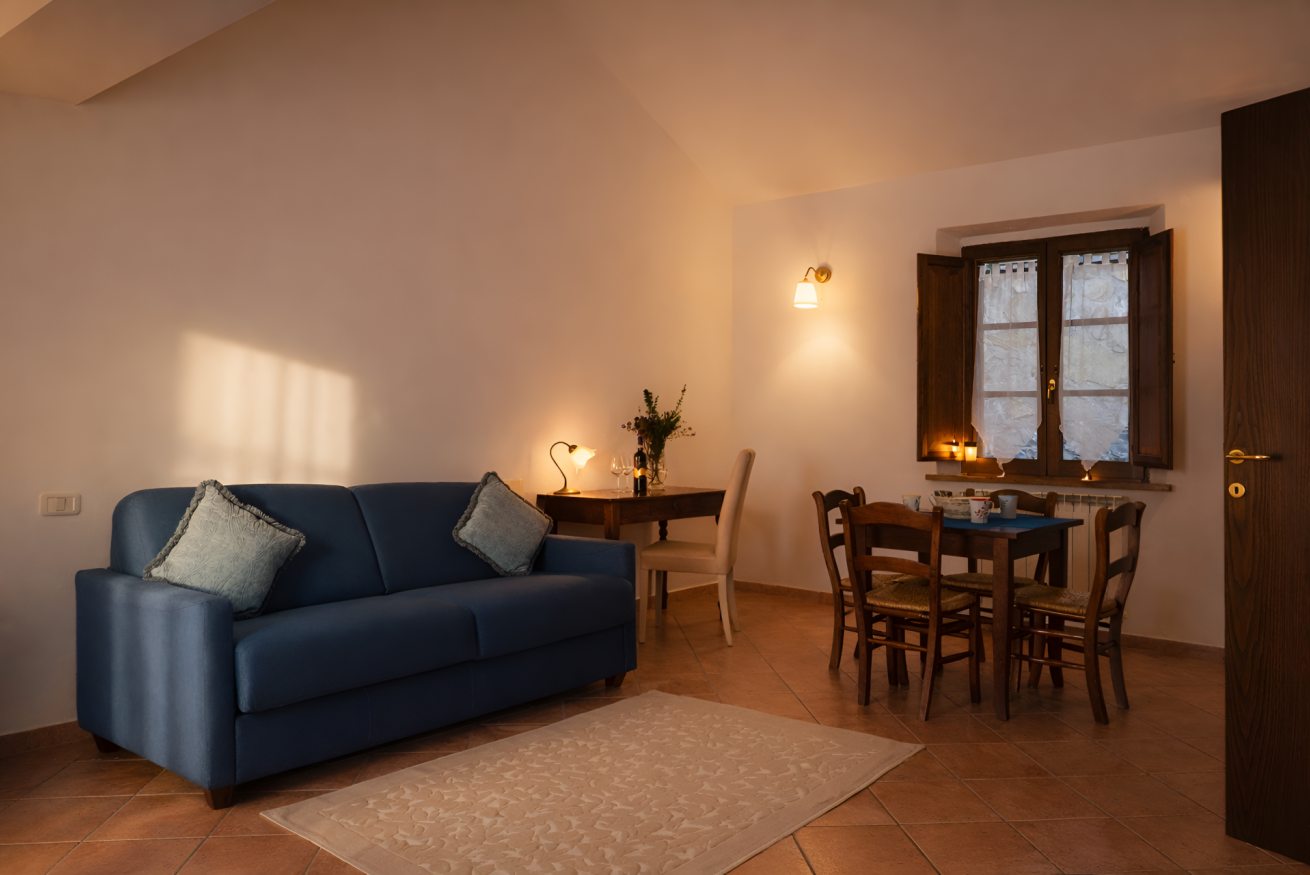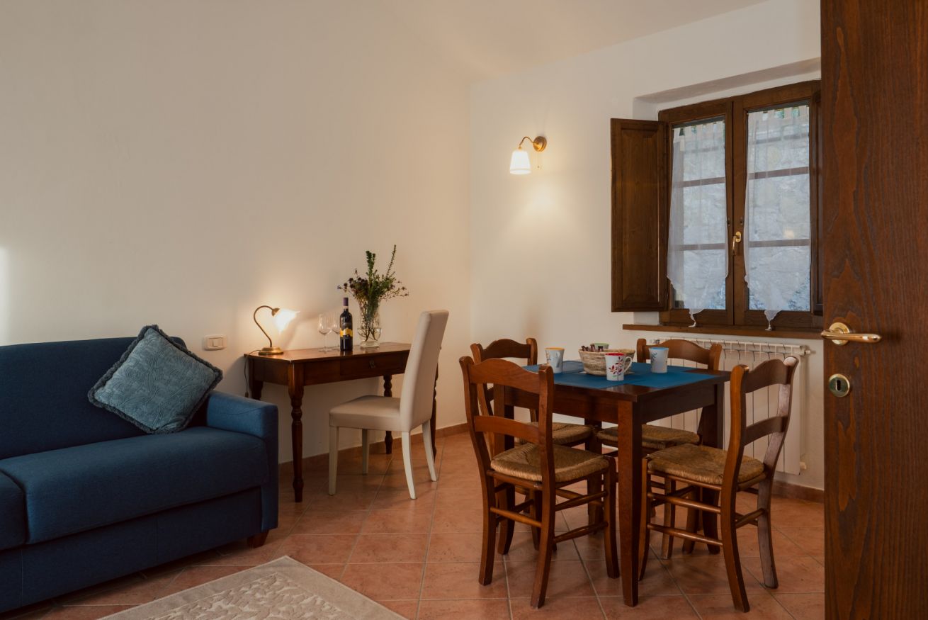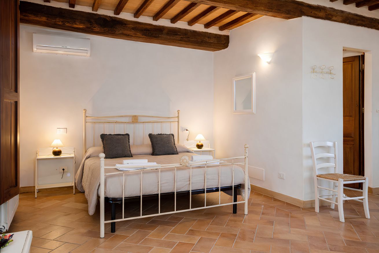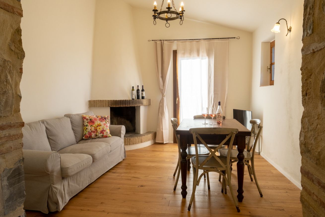 Elegant suite located on the 1st floor of the main farmhouse at Il Borgo, with living room, TV and sofa, fireplace. It has a double bedroom with private bathroom (ensuite) and optional double sofa bed in the living area. Air conditioning included. Access to the swimming pool.