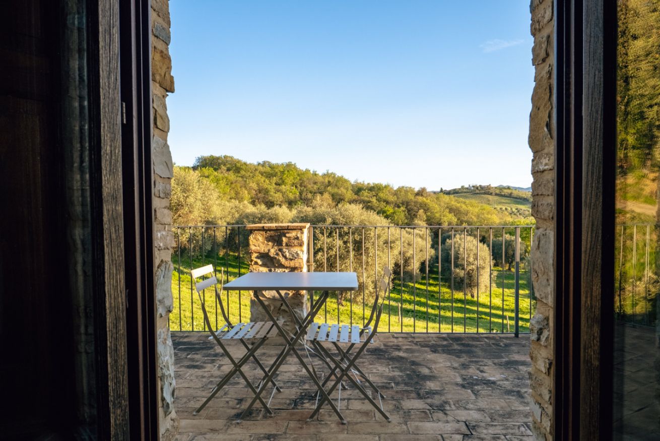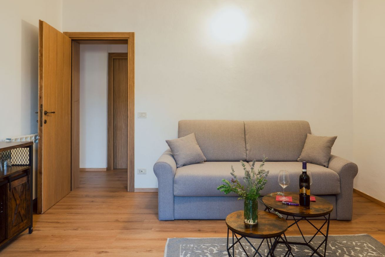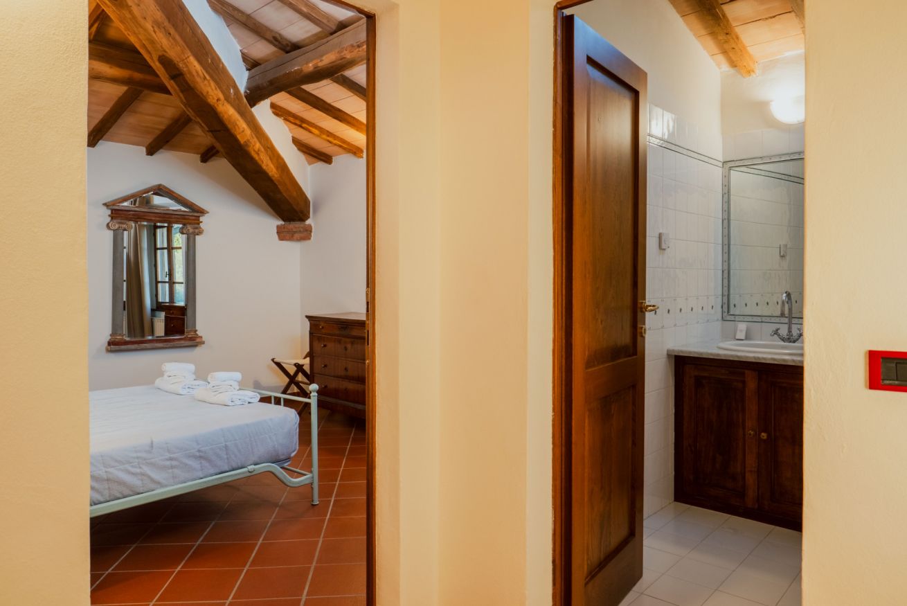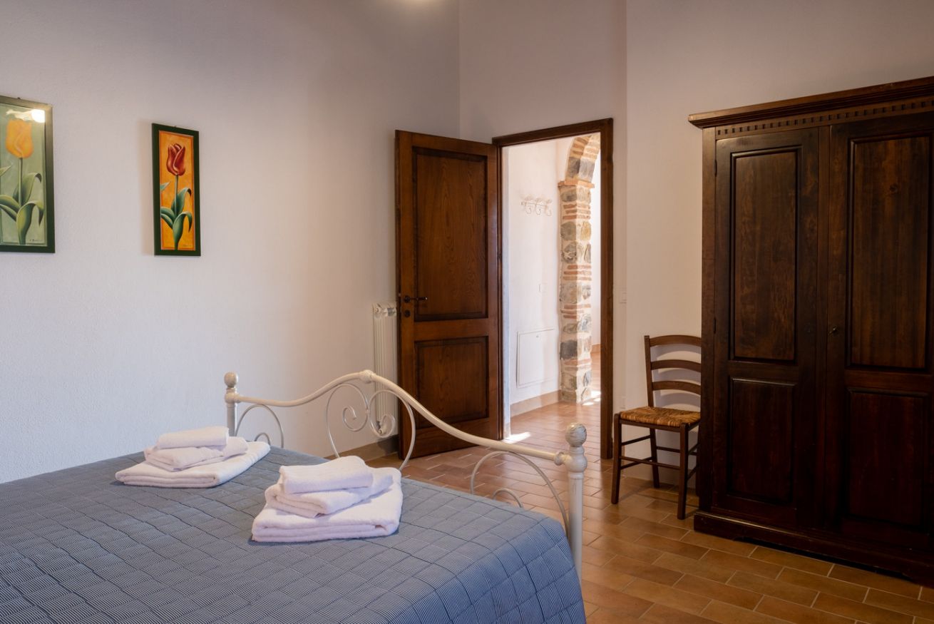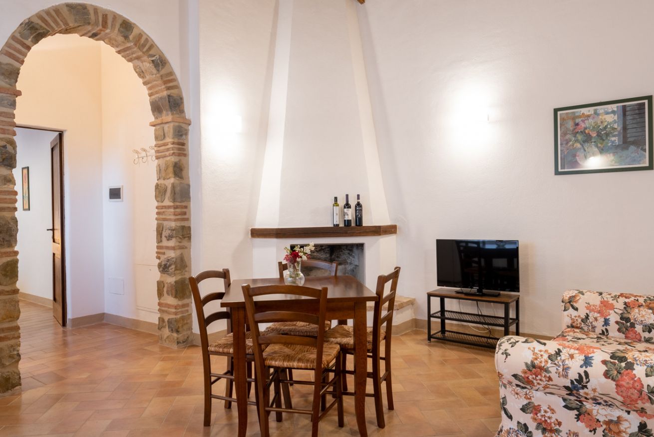 Elegant suite located on the 1st floor of the main farmhouse at Il Borgo, with living room, TV and sofa, fireplace. It has a double bedroom with private bathroom (ensuite) and optional double sofa bed in the living area. Air conditioning included. Access to the swimming pool.