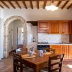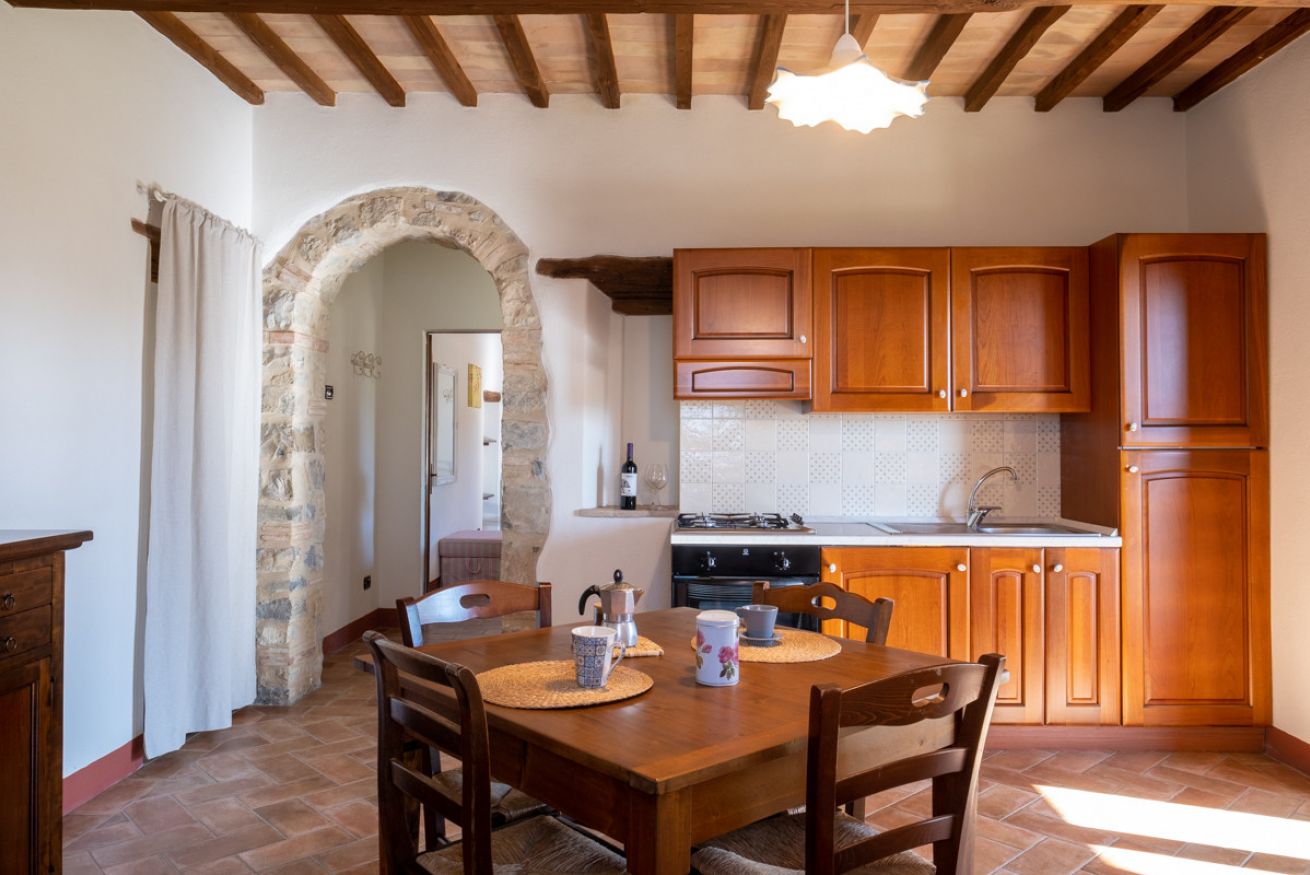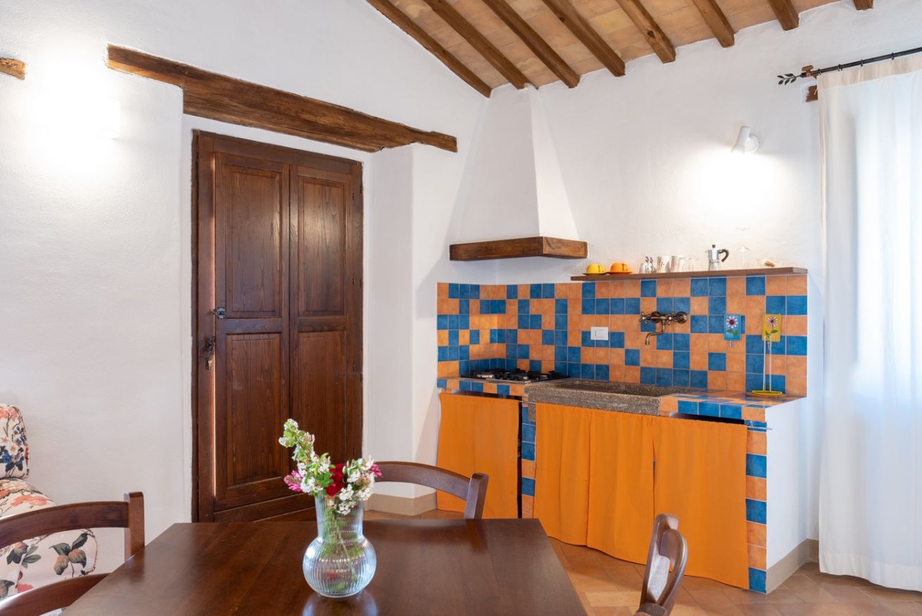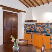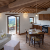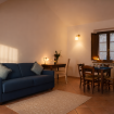 Practical flat in the farmhouse "Guardiano", at Il Borgo, featuring a comfortable living area with a fully equipped kitchen, sofa, TV, (optional: sofa bed). The sleeping area has a double bedroom and a bathroom. Air Condition. Outside, panoramic terrace (first floor) or patio with garden (ground floor) furnished for relaxation. Access to the swimming pool included.