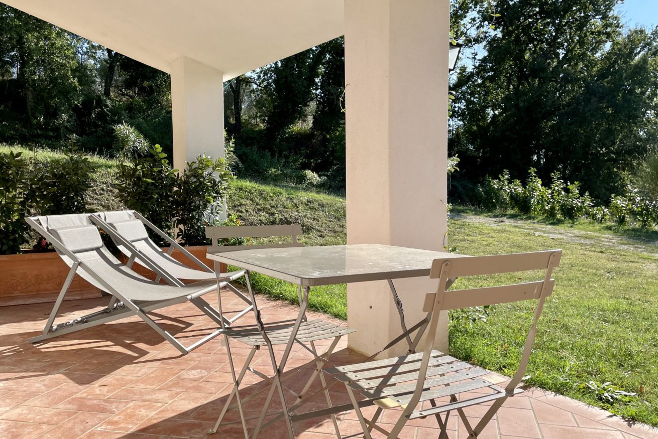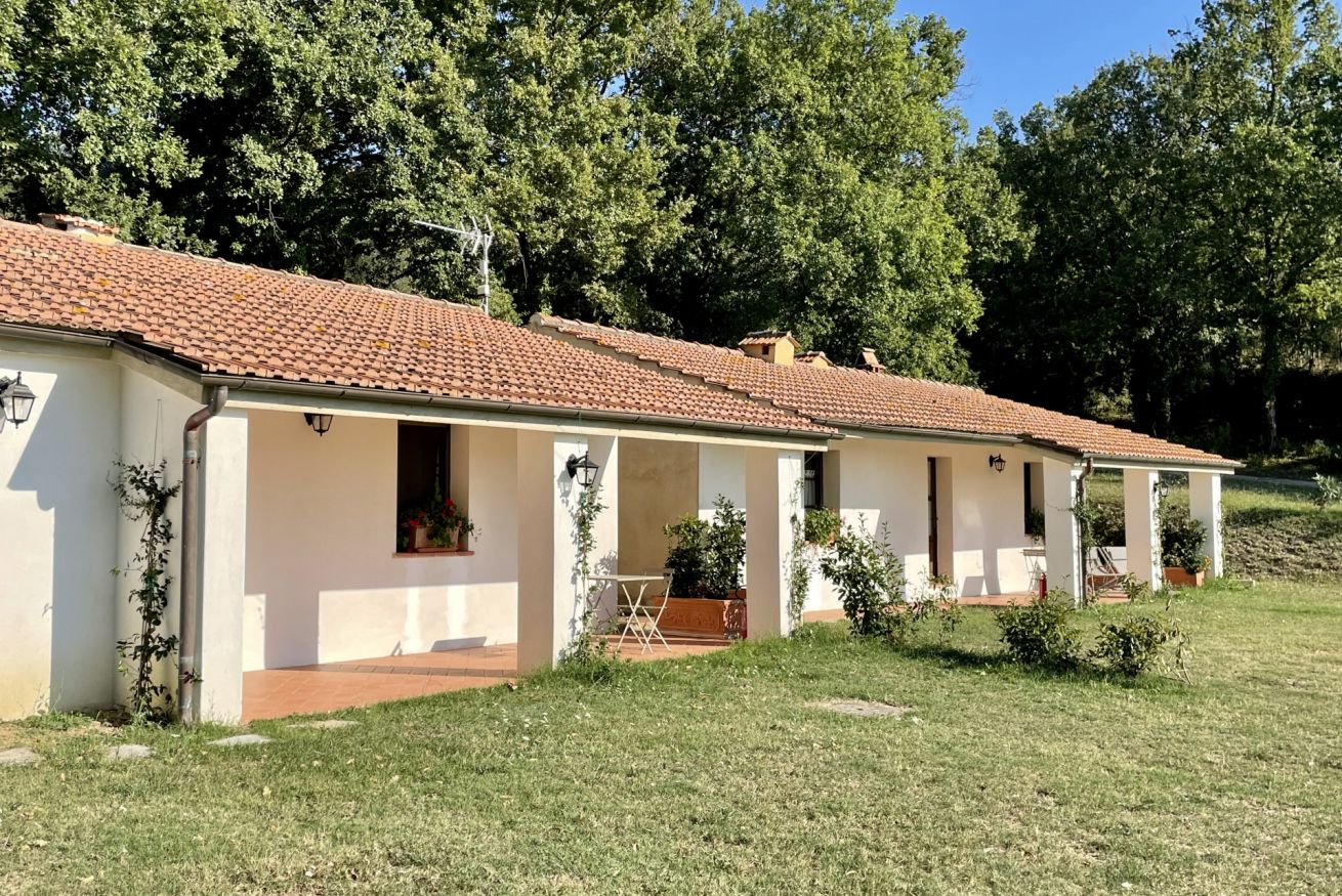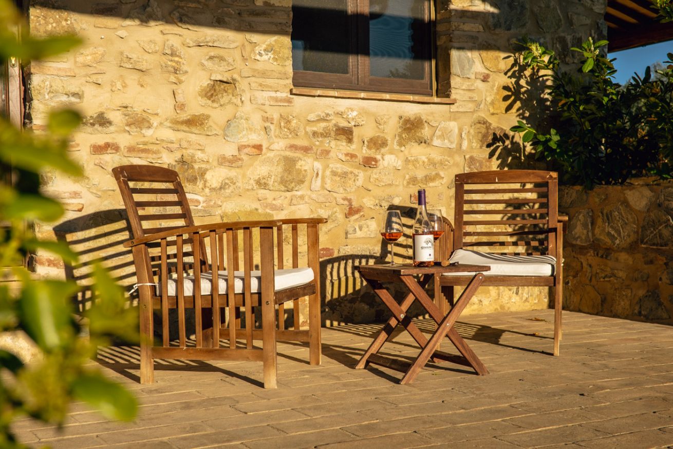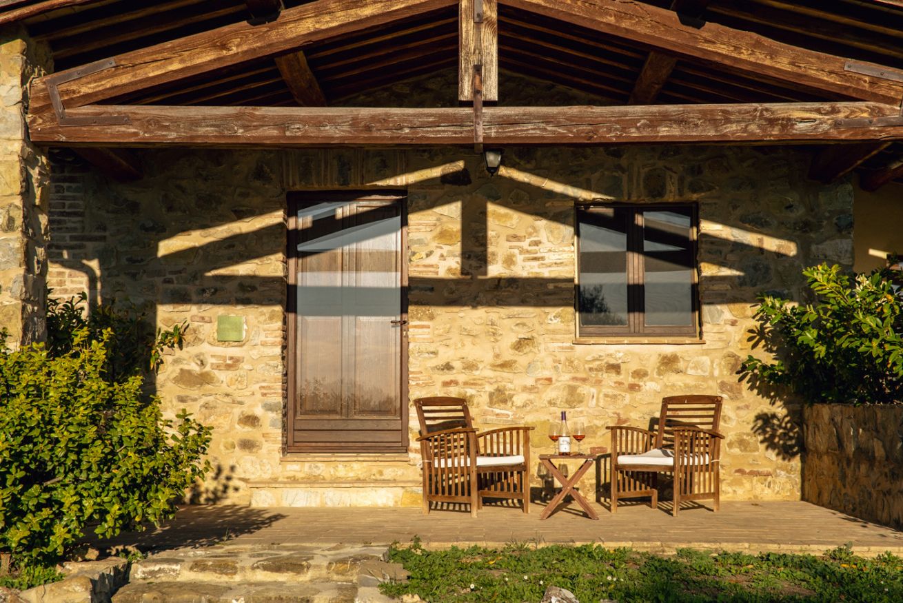 Double apartment on the ground floor of the farmhouse “Cacciatore" at Il Borgo, ideal for a comfortable stay. The living area includes a fully equipped kitchen, dining table, sofa and TV. The sleeping area offers a double bedroom and a private bathroom. Air Condition. Outside, furnished patio with private garden. Access to the pool included.