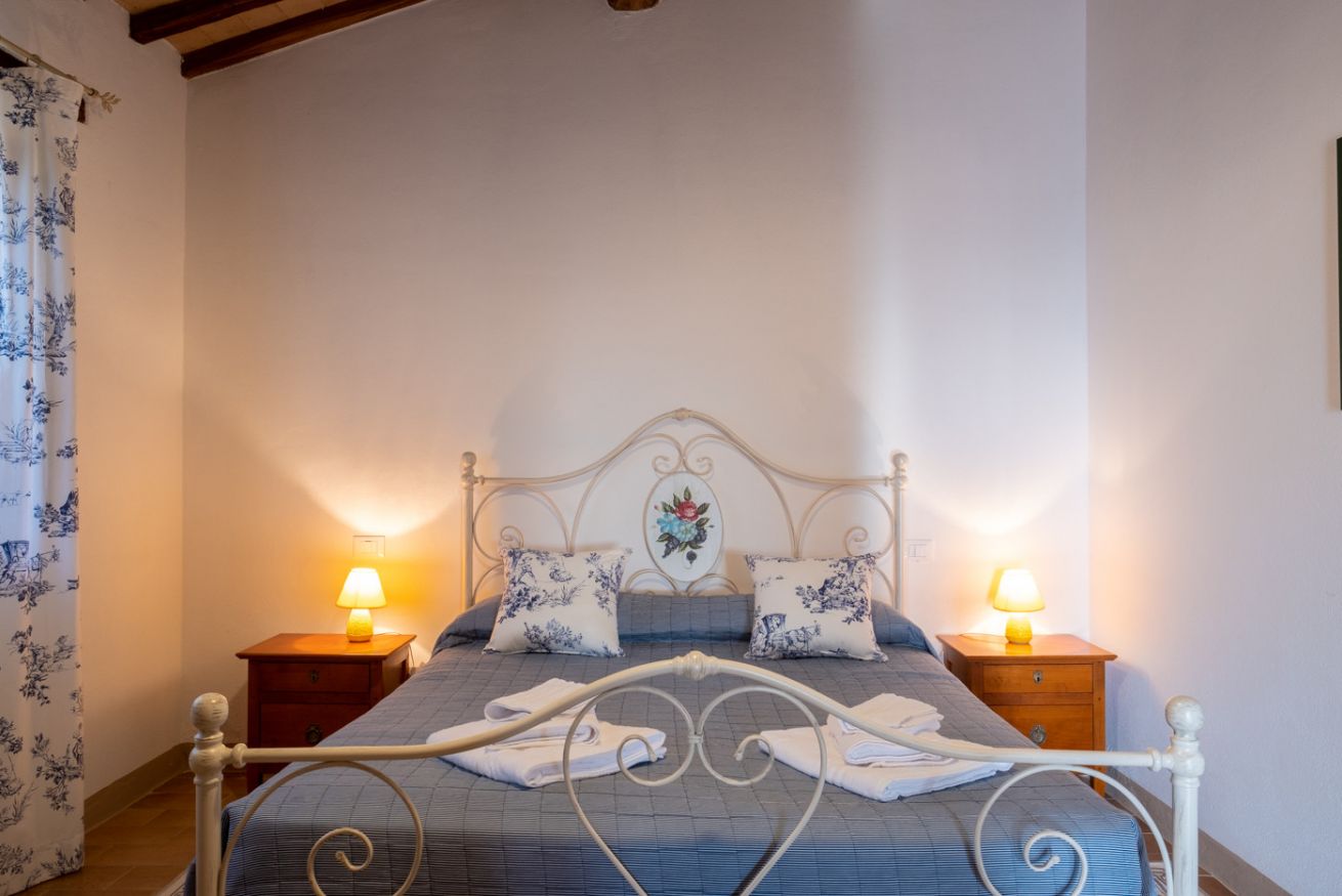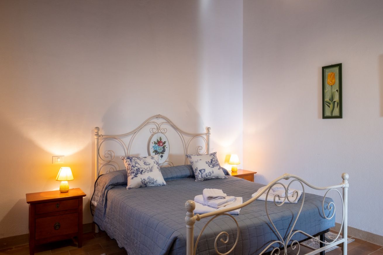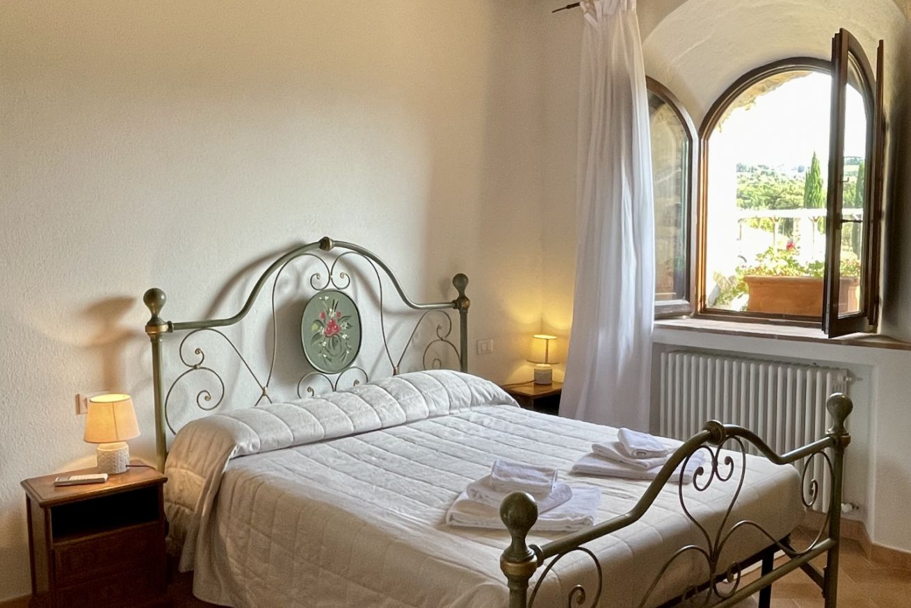 Double room located on the ground floor of the farmhouse “Scuderia" at Il Borgo, in a dwelling with only two units, equipped with a private bathroom. On request it can be combined with a living area with TV and double sofa bed, or second bedroom with two single beds (or double bed). Air Condition. Large outdoor area with private garden and panoramic view. Access to swimming pool.