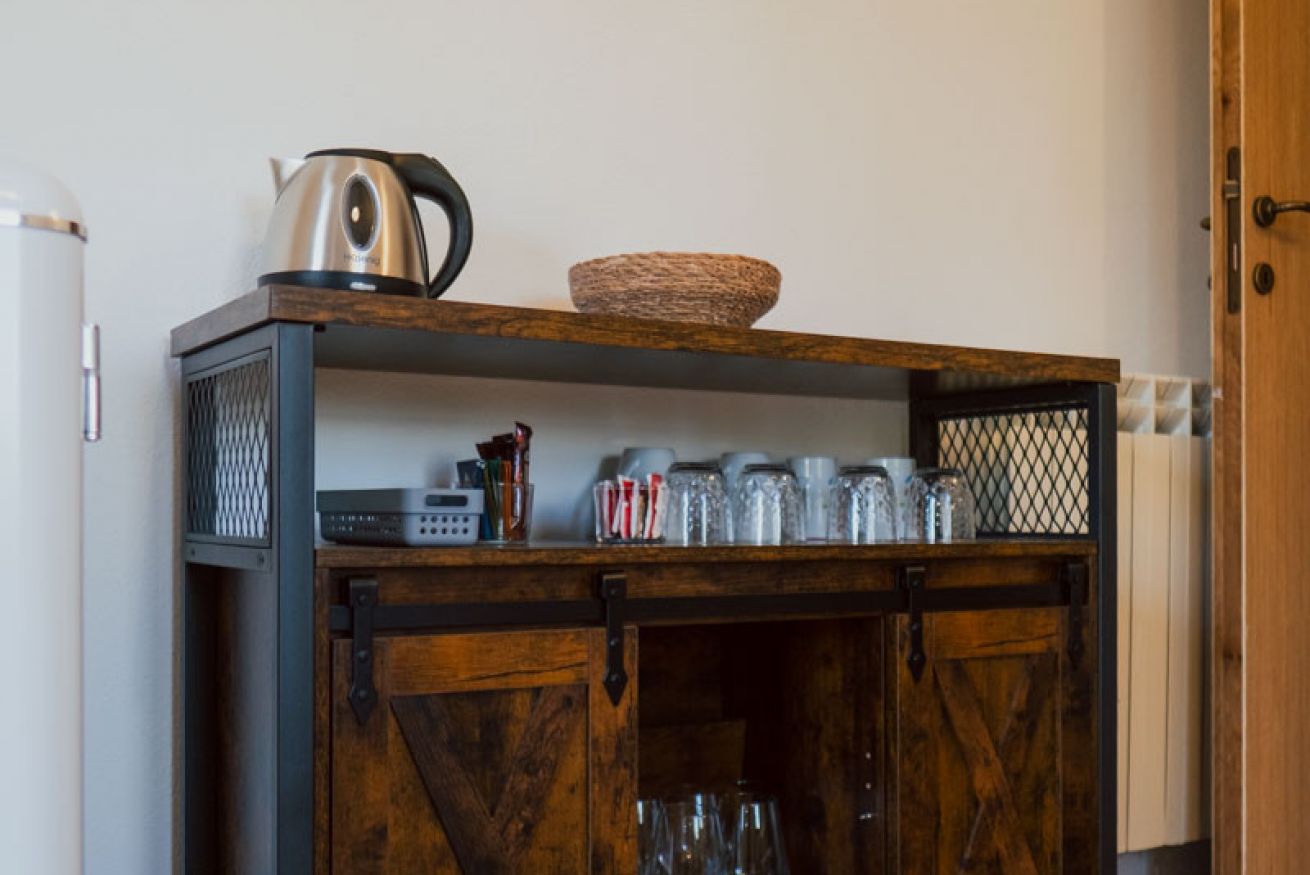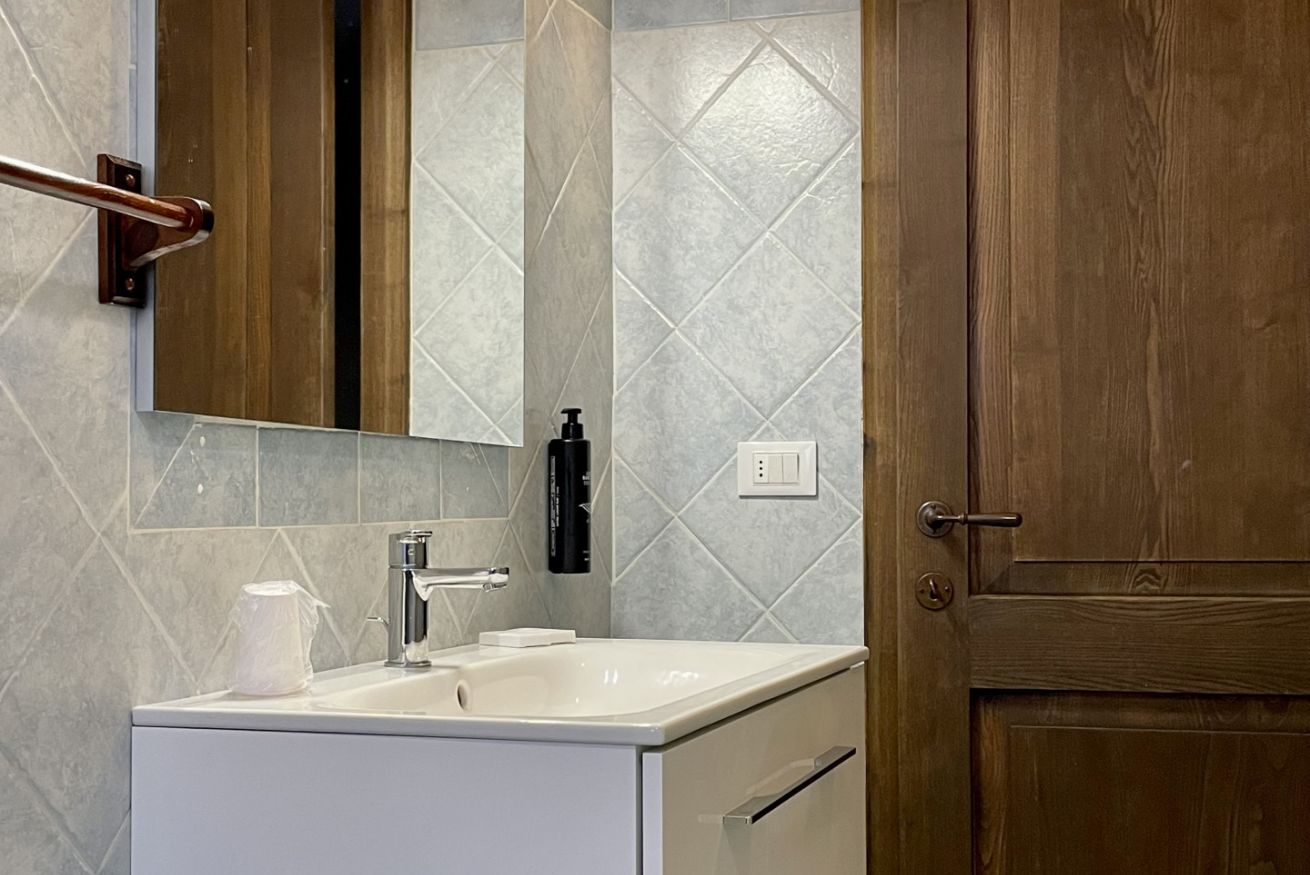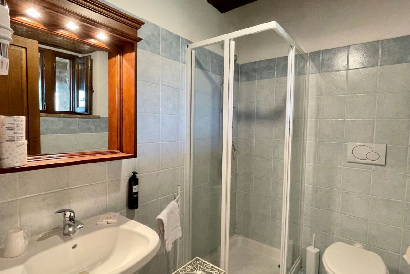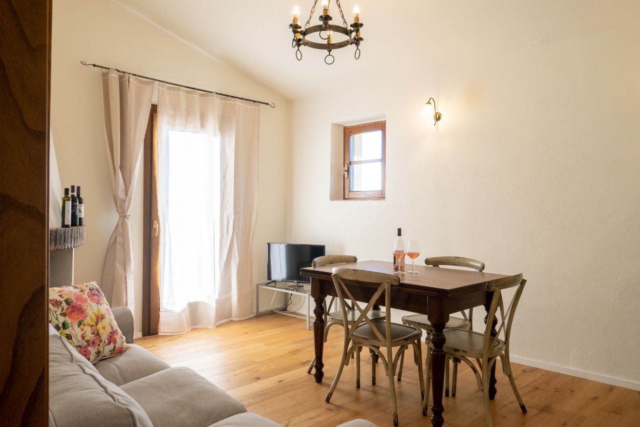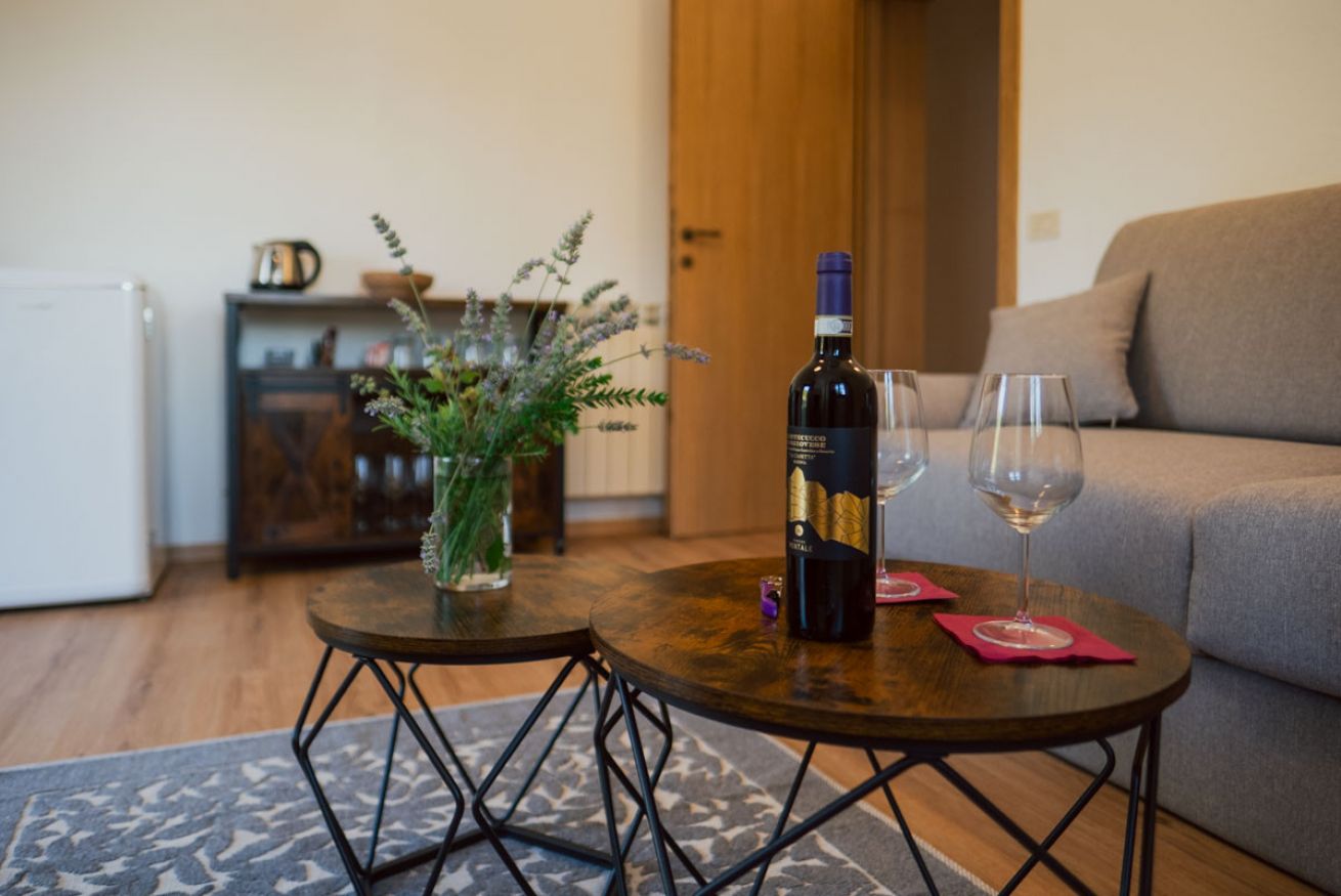 Spacious room located on the first floor of Casale Pastore at Il Borgo, featuring a living area with TV, sofa, fireplace and air condition. It includes a double bedroom with a private bathroom and the option of a double sofa bed in the living area. Outdoor terrace with a garden. Access to the swimming pool.