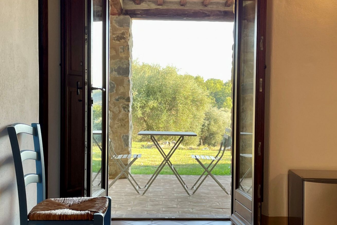 Ground-floor double room located in the “Cacciatore” farmhouse at Il Borgo. It features a private bathroom, TV and a comfortable sofa, offering a welcoming and relaxing atmosphere. Air conditioning is included. Outside, a private patio opens onto a garden with an open south-facing view, perfect for enjoying the light and the surrounding landscape.