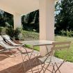 Spacious ground-floor quadruple apartment featuring a fully equipped kitchen, living area with TV, and air conditioning. The entrance leads to an open-plan living room with a fireplace, sofas, TV, dining table, and large kitchen. The apartment includes two double bedrooms and two bathrooms with showers (one ensuite, one in the hallway). Outside, guests can enjoy a private, scenic garden with outdoor furniture overlooking the Val d'Orcia. An electric vehicle charging station is available. The apartment is located at the Winery and has direct access to the adjacent wine cellar.